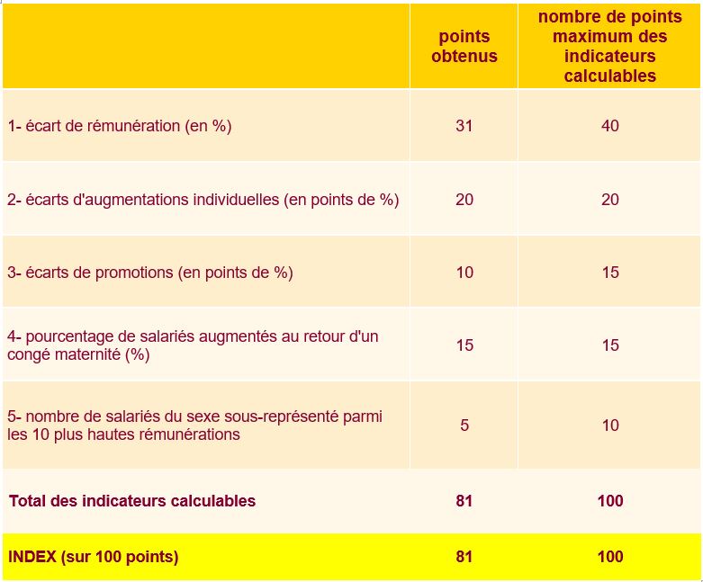 La loi pour la liberté de choisir son avenir professionnel, promulguée le 5 septembre 2018, a créé de nouvelles obligations pour lutter contre les inégalités de rémunération entre les femmes et les hommes, appuyée par la loi du 24 décembre 2021 visant à accélérer l’égalité économique et professionnelle entre les deux sexes. Chaque année les entreprises devront calculer l’index de l’égalité femmes-hommes à partir de plusieurs indicateurs, rendre public la note qu’elles obtiennent et, le cas échéant, prendre des mesures correctives pour réduire les disparités salariales entre les femmes et les hommes. Cet index est sur 100 points et se calcule objectivement à partir de 5 indicateurs : l’écart de rémunération femmes hommes, l’écart de répartition des augmentations individuelles, l’écart de répartition des promotions (uniquement dans les entreprises de plus de 250 salariés), le pourcentage de salariées augmentées à leur retour de congé de maternité, le nombre de personnes du sexe sous-représenté parmi les 10 plus hautes rémunérations. La note doit être au moins de 75 points ; à défaut les écarts devront être corrigés sur 3 ans.