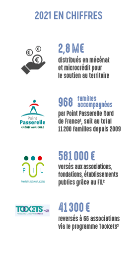 Le Crédit Agricole Mutuel Nord de France est engagé dans la réussite de son territoire et soutient chaque année des initiatives dans les domaines de la solidarité, de l’environnement, de l’accompagnement social, de la culture, du sport, de l’éducation, du patrimoine et de la santé.