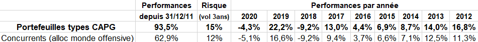Comme chaque mois, voici le tableau des performances des investissements que nous conseillons : nous avons investi 100 000 euros sur chaque portefeuille type au 31 Décembre 2011, et nous donnons donc la performance du portefeuille et de chaque ligne pour les supports PEA et assurance-vie (Floriane et Espace Liberté) au 31/07/2020.