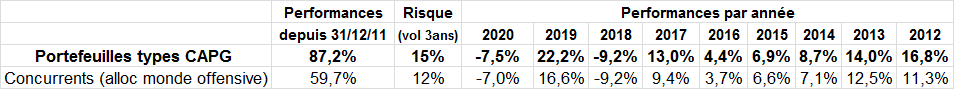 Par rapport à nos concurrents (catégorie Quantalys allocation Monde offensive) notre avance est de +27,5%, avec une performance globale de +87,2% depuis le 31/12/2011. Résultats de nos conseils d’investissements au 29/05/2020 :
