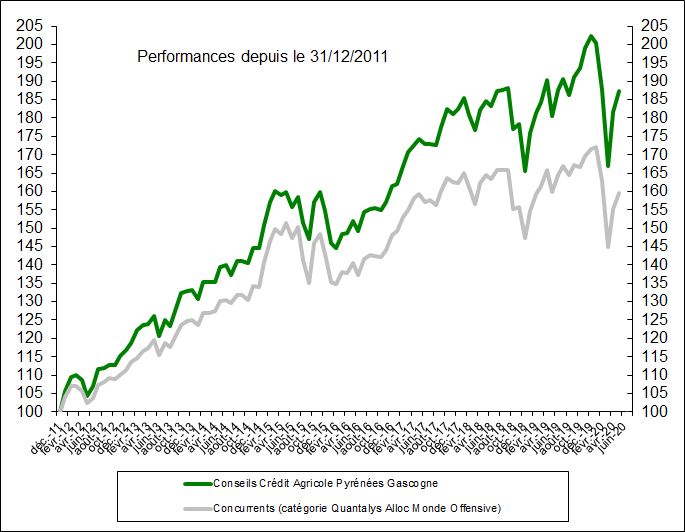 Par rapport à nos concurrents (catégorie Quantalys allocation Monde offensive) notre avance est de +27,5%, avec une performance globale de +87,2% depuis le 31/12/2011. Résultats de nos conseils d’investissements au 29/05/2020 :