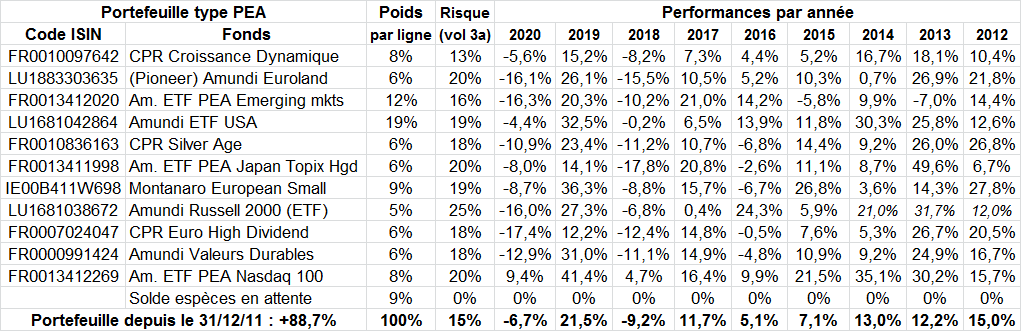 Comme chaque mois, voici le tableau des performances des investissements que nous conseillons : nous avons investi 100 000 euros sur chaque portefeuille type au 31 Décembre 2011, et nous donnons donc la performance du portefeuille et de chaque ligne pour les supports PEA et assurance-vie (Floriane et Espace Liberté) au 29/05/2020.