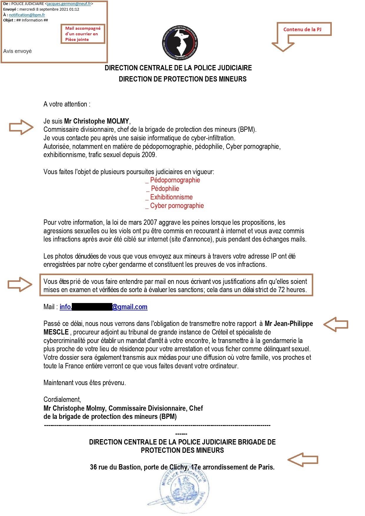 - Des détails Réalistes : Les interlocuteurs désignés dans ce courrier existent bien. Christophe MOLMY par exemple est bien à la tête de la Brigade de Protection de Mineurs depuis janvier dernier et Jean-Philippe MESCLE est également en poste en qualité de procureur de la République adjoint près le tribunal judiciaire de Créteil.