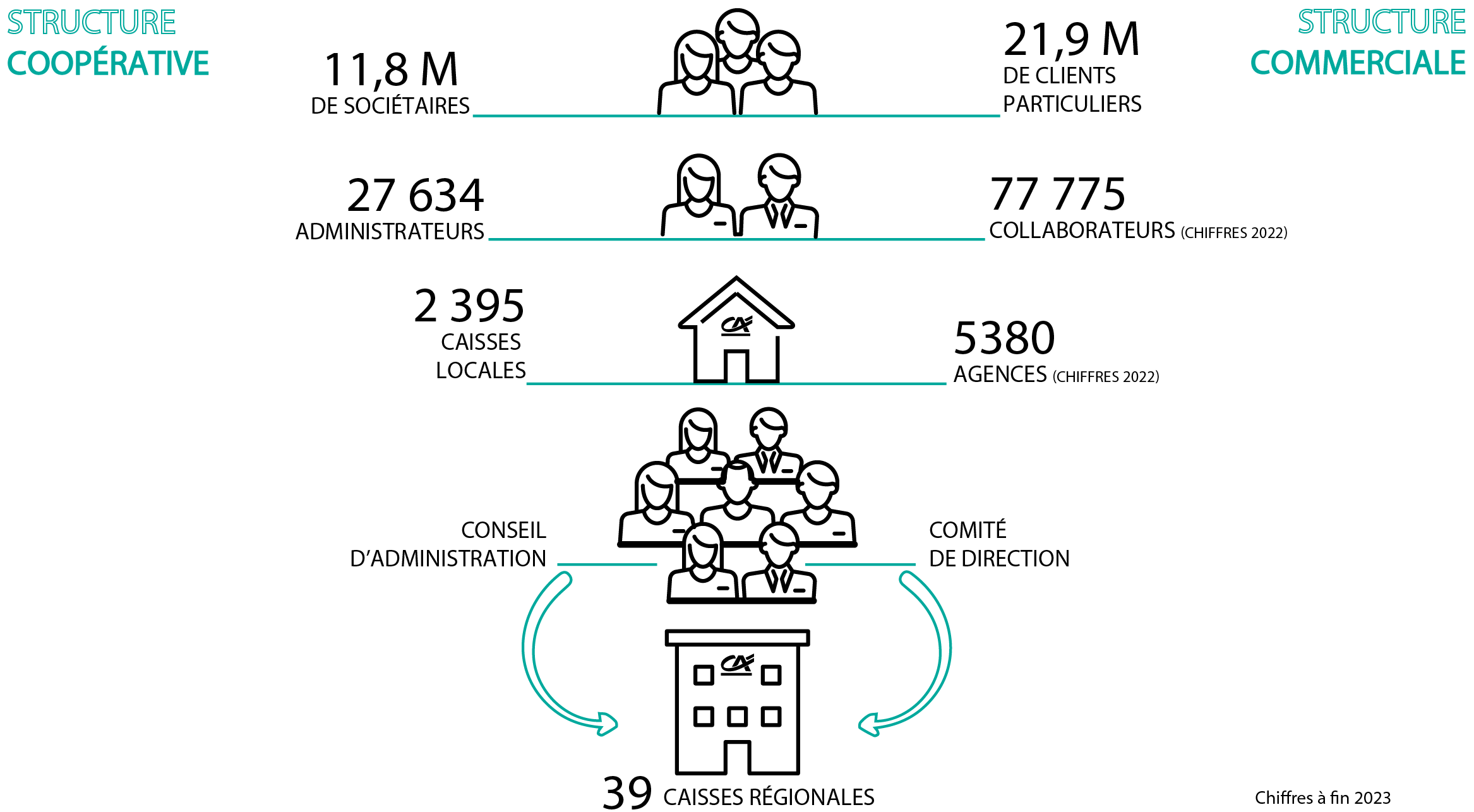 Le Crédit Agricole s’est construit de façon décentralisée, en s’appuyant sur l’initiative locale et l’autonomie des Caisses régionales qui sont au cœur de l’organisation. Sociétés coopératives de personnes, elles ont toujours fondé leur développement et leur succès sur les femmes et les hommes, salariés, élus, dirigeants.